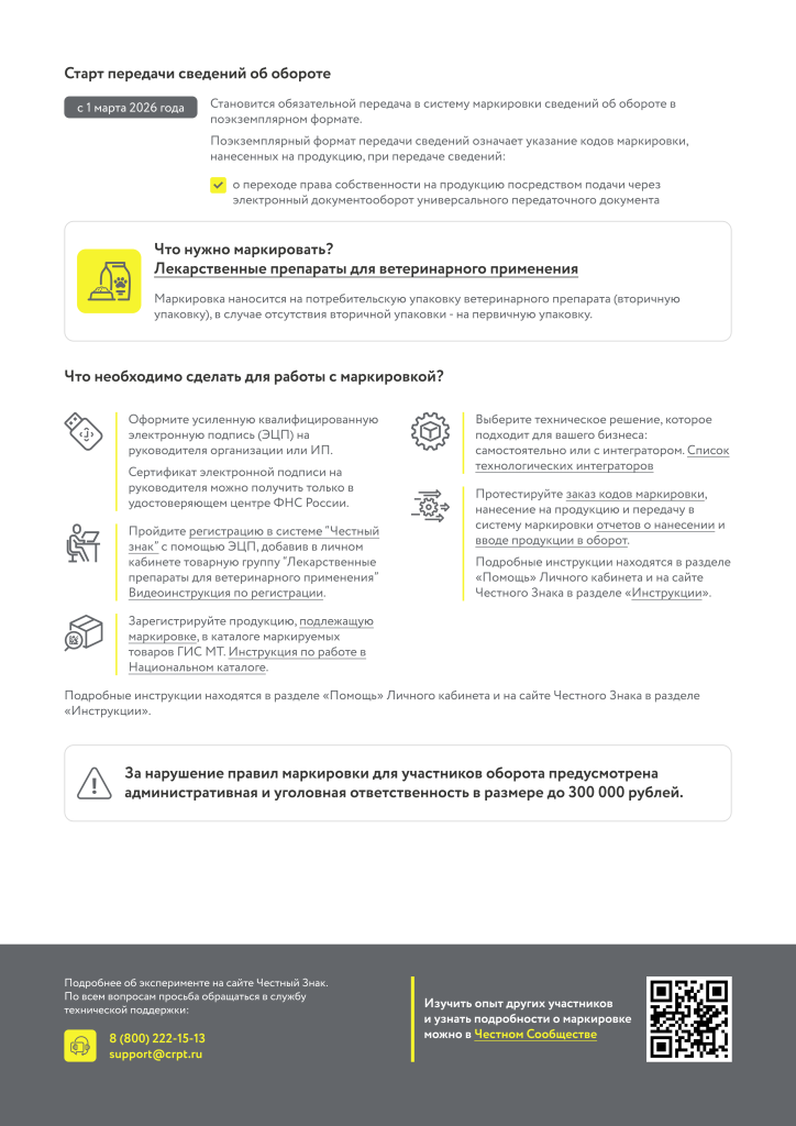 Согласно постановлению Правительства Российской Федерации от 27 мая 2024 № 675 «Об утверждении Правил маркировки лекарственных препаратов для ветеринарного применения средствами идентификации и особенностях внедрения государственной информационной системы мониторинга за оборотом товаров, подлежащих обязательной маркировке средствами идентификации, в отношении лекарственных препаратов для ветеринарного применения» на территории Российской Федерации с 1 марта 2025 года вступили в силу требования о передаче в информационную систему маркировки сведений о розничной продаже ветеринарных препаратов.